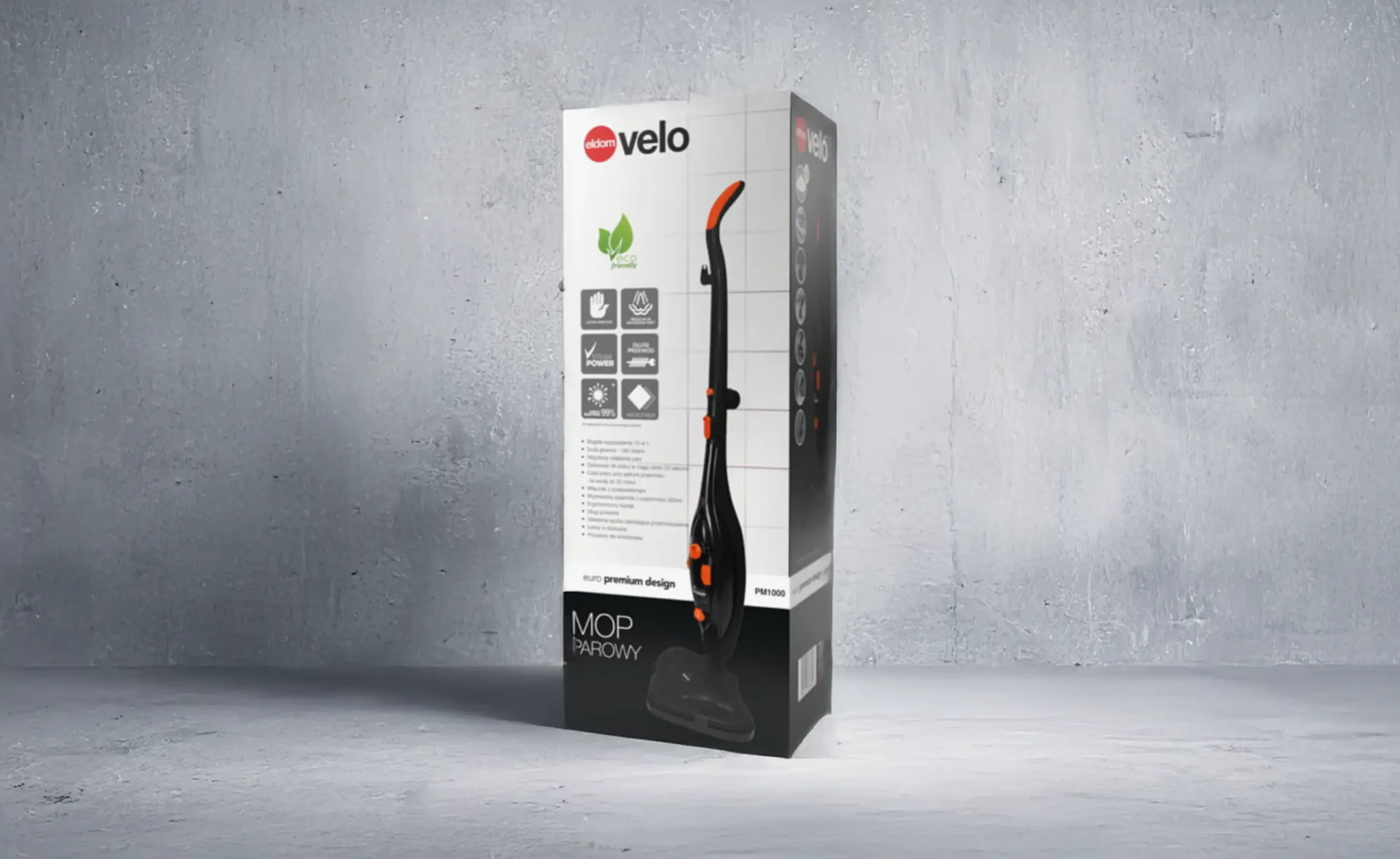 Pracę rozpoczęliśmy od wykonania zdjęć mopa parowego, aby następnie wykorzystać je na kolorowym opakowaniu z oficjalnej linii produktów Eldom. Finalnie całość została starannie dopasowana do istniejącej szaty graficznej, dzięki czemu zachowaliśmy pełną spójność wizualną z resztą serii.
